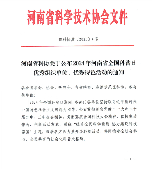 近日,河南省科协下发《关于公布2024年河南省全国科普日优秀组织单位、优秀特色活动的通知》,qm球盟会网站,球盟会qmh网页版登录荣获2024年河南省全国科普日优秀组织单位。