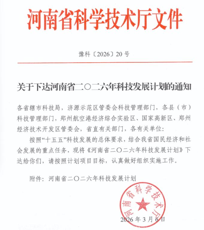 近日,河南省科技厅正式发布《关于下达河南省二〇二六年科技发展计划的通知》,qm球盟会网站两位老师申报的课题成功获批,涵盖1项科技攻关项目和1项软科学项目,均获得经费资助。本次获批项目的经费总量也是qm球盟会网站在省级科研项目申报中的一次新进展,标志着qm球盟会网站2026年度省级项目申报工作实现良好开局,也为深入推进“双高”建设、赋能地方产业发展注入了新动能。